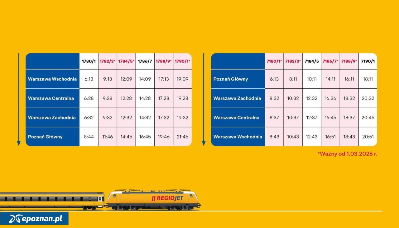 - Pierwszy pociąg odjeżdża z Warszawy Centralnej o 6:28 i dociera do Poznania Głównego o 8:44. W przeciwnym kierunku pociąg z Poznania Głównego odjeżdża o 10:11 i dociera do Warszawy Centralnej krótko po 12:30 - informuje przewoźnik. - Podróżni mogą liczyć na szybką i wygodną podróż w pociągach drugiego najlepszego przewoźnika kolejowego w Europie - dodaje.
