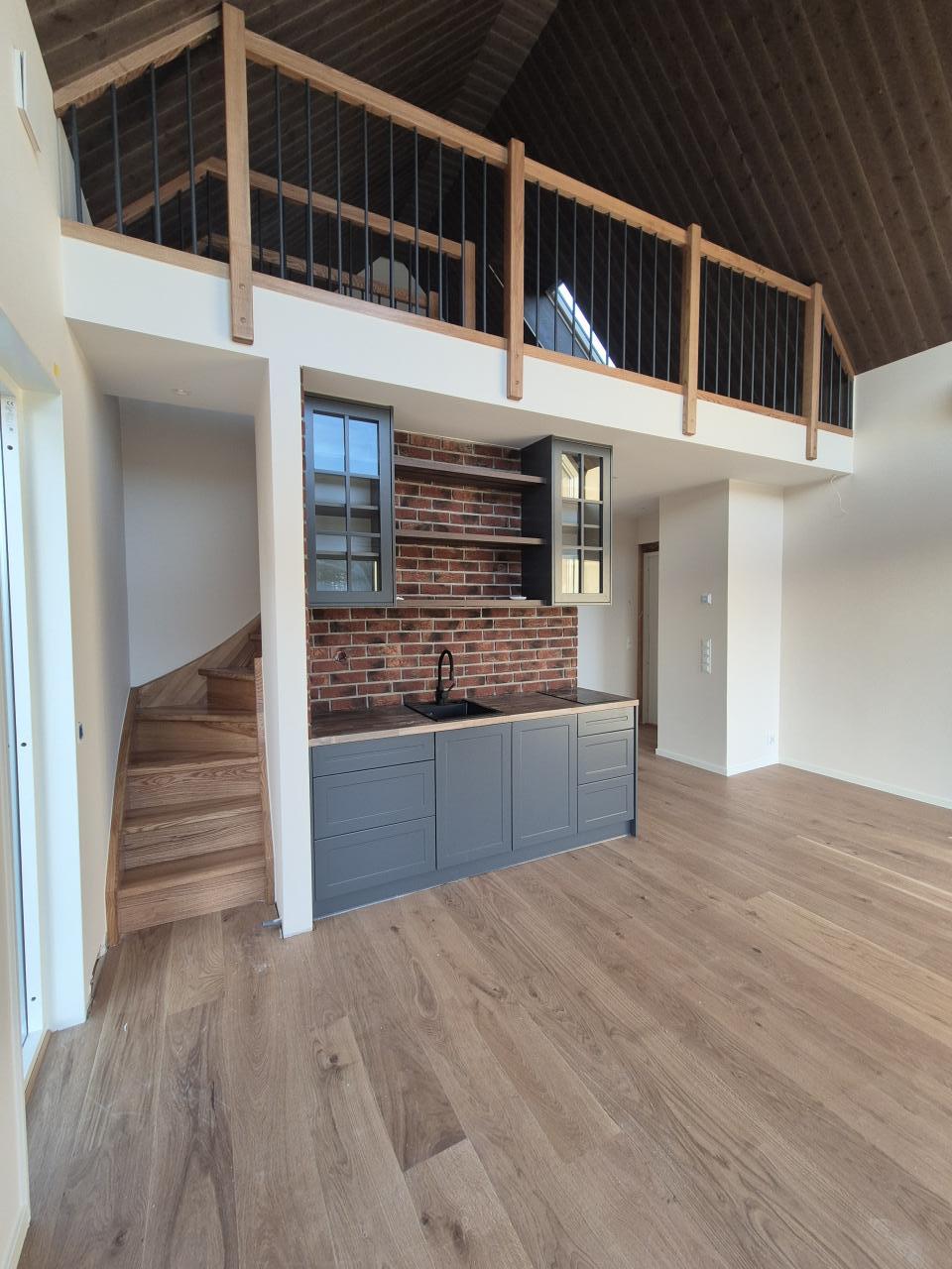 Każdy domek posiada 46 m² powierzchni całkowitej. Na parterze znajduje się salon z aneksem kuchennym, sypialnia oraz łazienka, natomiast dodatkowym atutem jest antresola, którą można w pełni zabudować, zwiększając powierzchnię nawet do 60 m². Takie rozwiązanie daje właścicielom elastyczność aranżacyjną i realnie podnosi wartość nieruchomości - zarówno użytkową, jak i inwestycyjną.