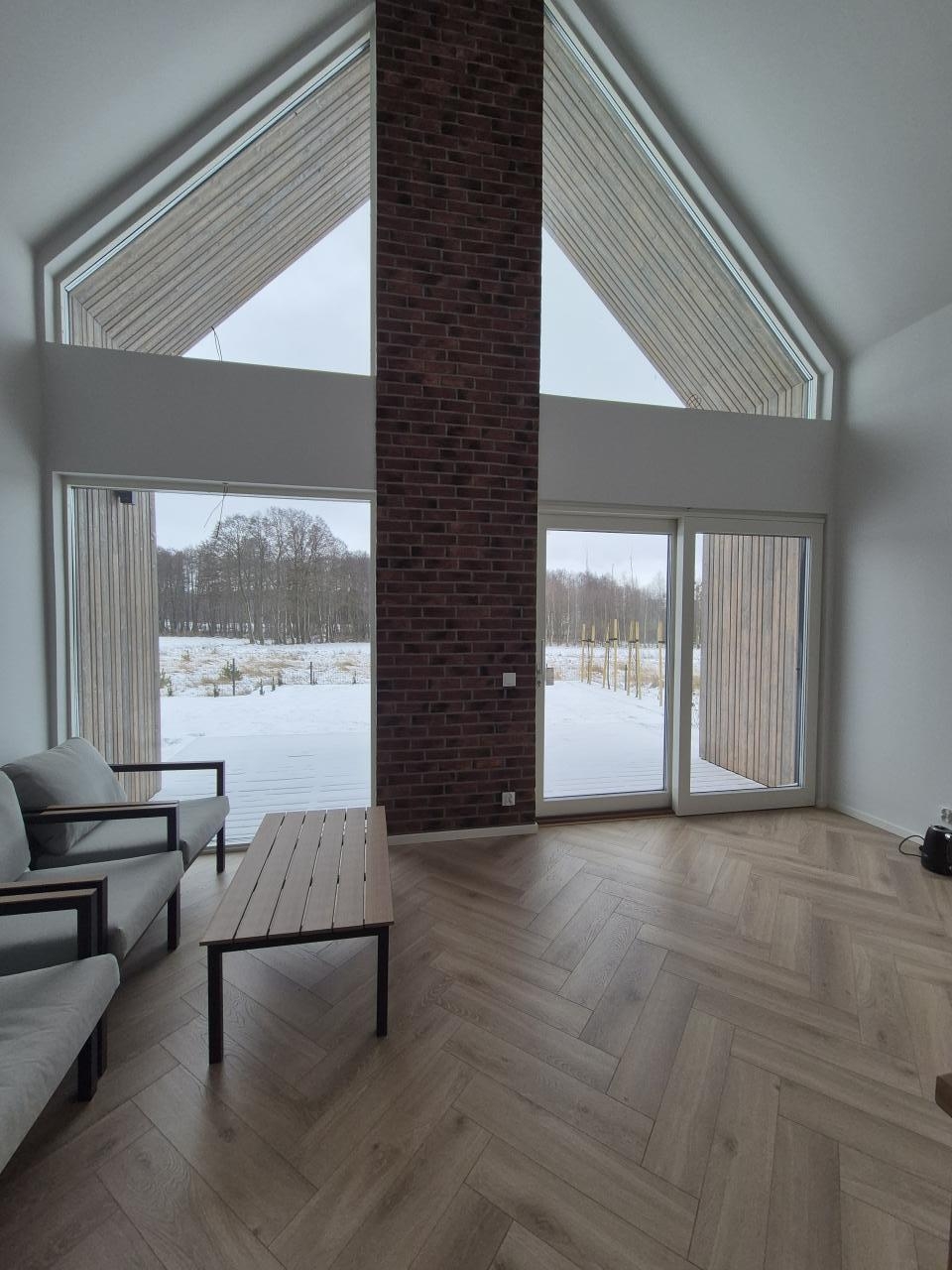 Strefa dzienna została wyposażona w przesuwne okna tarasowe drewniano-aluminiowe, które zapewniają doskonałe doświetlenie wnętrz i płynnie łączą przestrzeń mieszkalną z tarasem oraz zielenią.