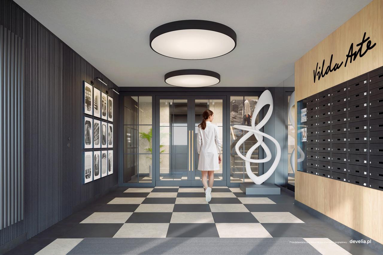 Vilda Arte już od progu wita starannie zaprojektowaną przestrzenią wspólną z eleganckim połączeniem barw, faktur i materiałów. Na parterze uwagę przyciągają klasyczny motyw szachownicy na posadzce, panele ścienne imitujące drewno oraz grafitowe akcenty elewacyjne. Stonowane beże na wyższych kondygnacjach nadają wnętrzom charakteru, spokoju i harmonii, a całość dopełniają gustowne balustrady, duże lustra i stylowe fotografie.