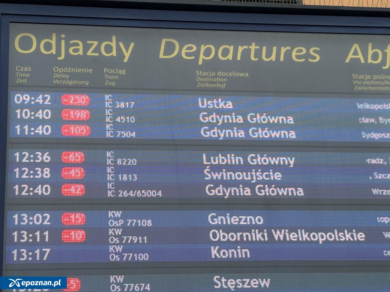 Nie tylko pasażerowie z poznańskiej Ławicy muszą w czwartek liczyć się z opóźnieniami (TU pisaliśmy o sytuacji na lotnisku). Pogoda sprawia, że opóźnienia występują też na kolei. W przypadku odjazdów z Poznania Głównego największe opóźnienie ma w tej chwili pociąg Kolei Wielkopolskich relacji Krotoszyn - Kłodawa. To już 200 minut opóźnienia, a więc ponad trzy godziny. Z informacji podawanych przez kolejarzy wynika, że powodem jest m.in. wydłużające się oczekiwanie na obsługę pociągu.