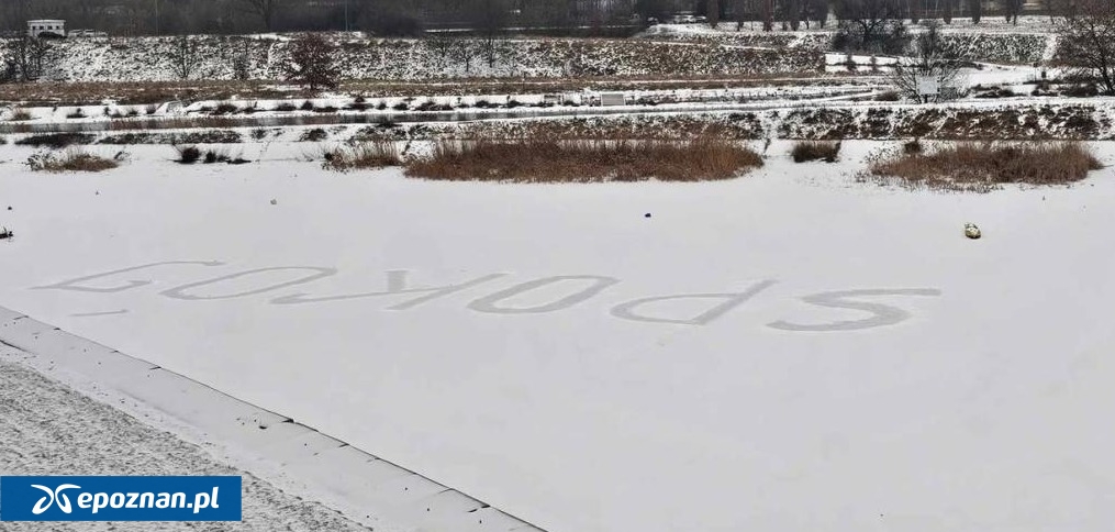 Niestety, jak widać na zdjęciu, ktoś postanowił wejść na zamarzniętą taflę Warty w Starym Porcie i zrobić na niej napis... "SPOKÓJ". Apelujemy o rozwagę.