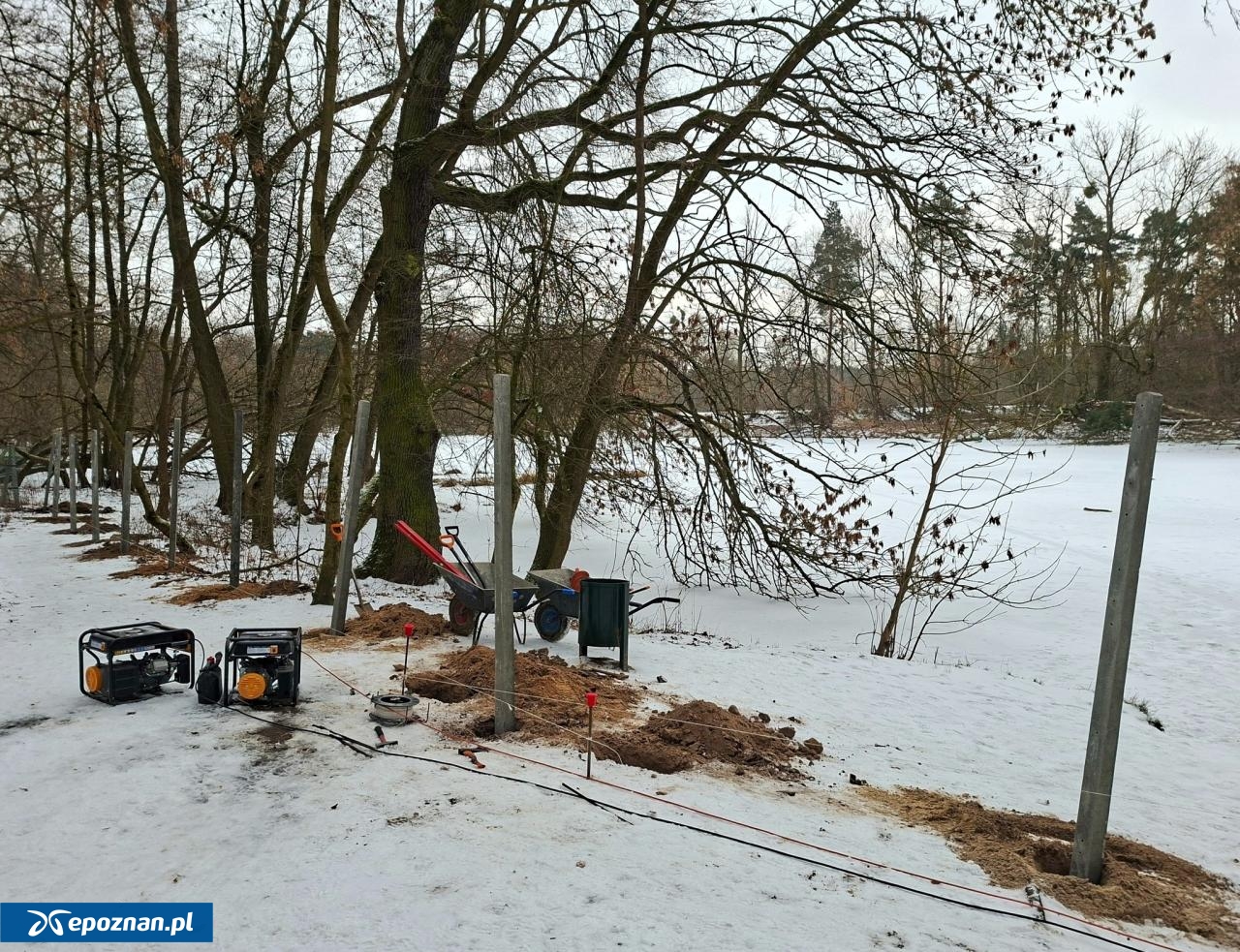 Stawiają płot nad stawem na Dębinie