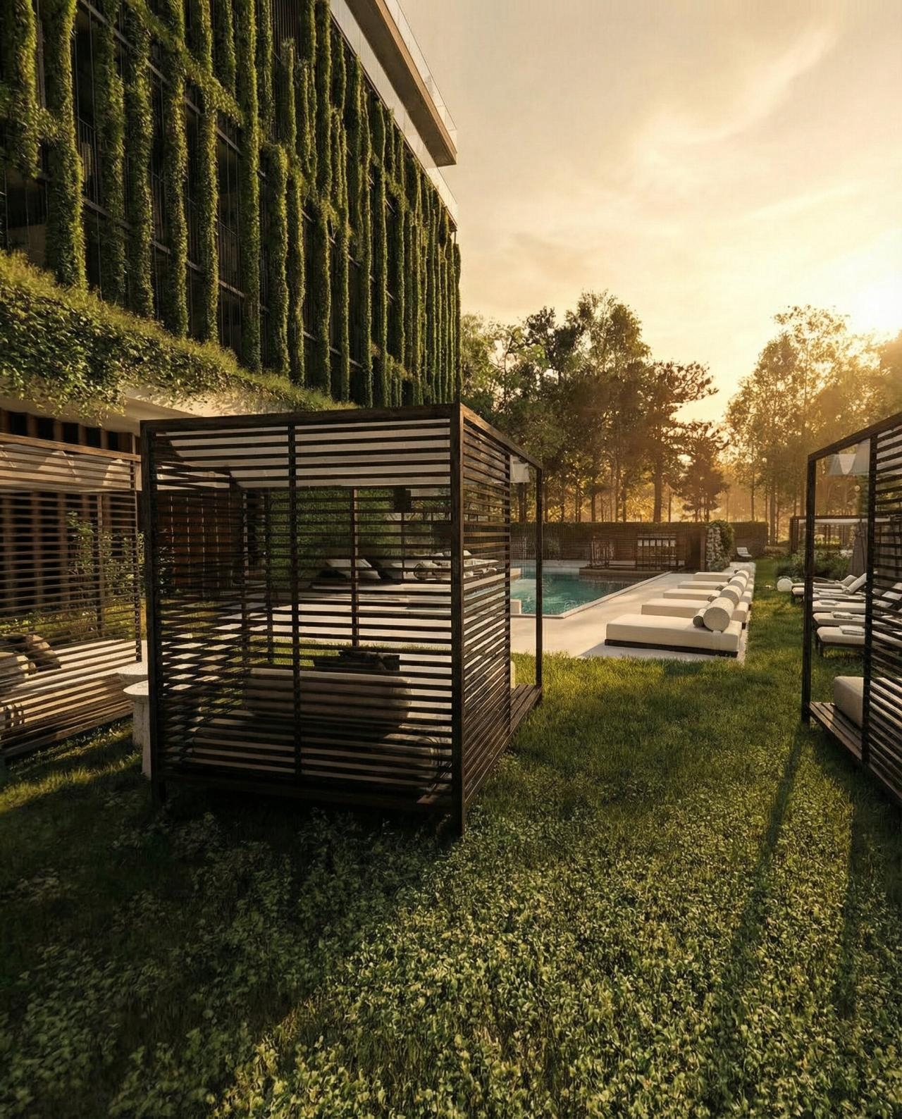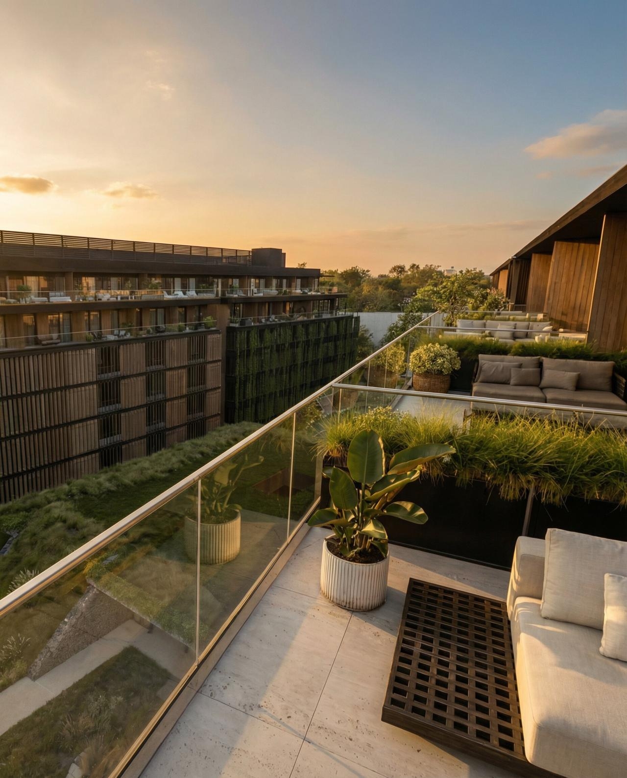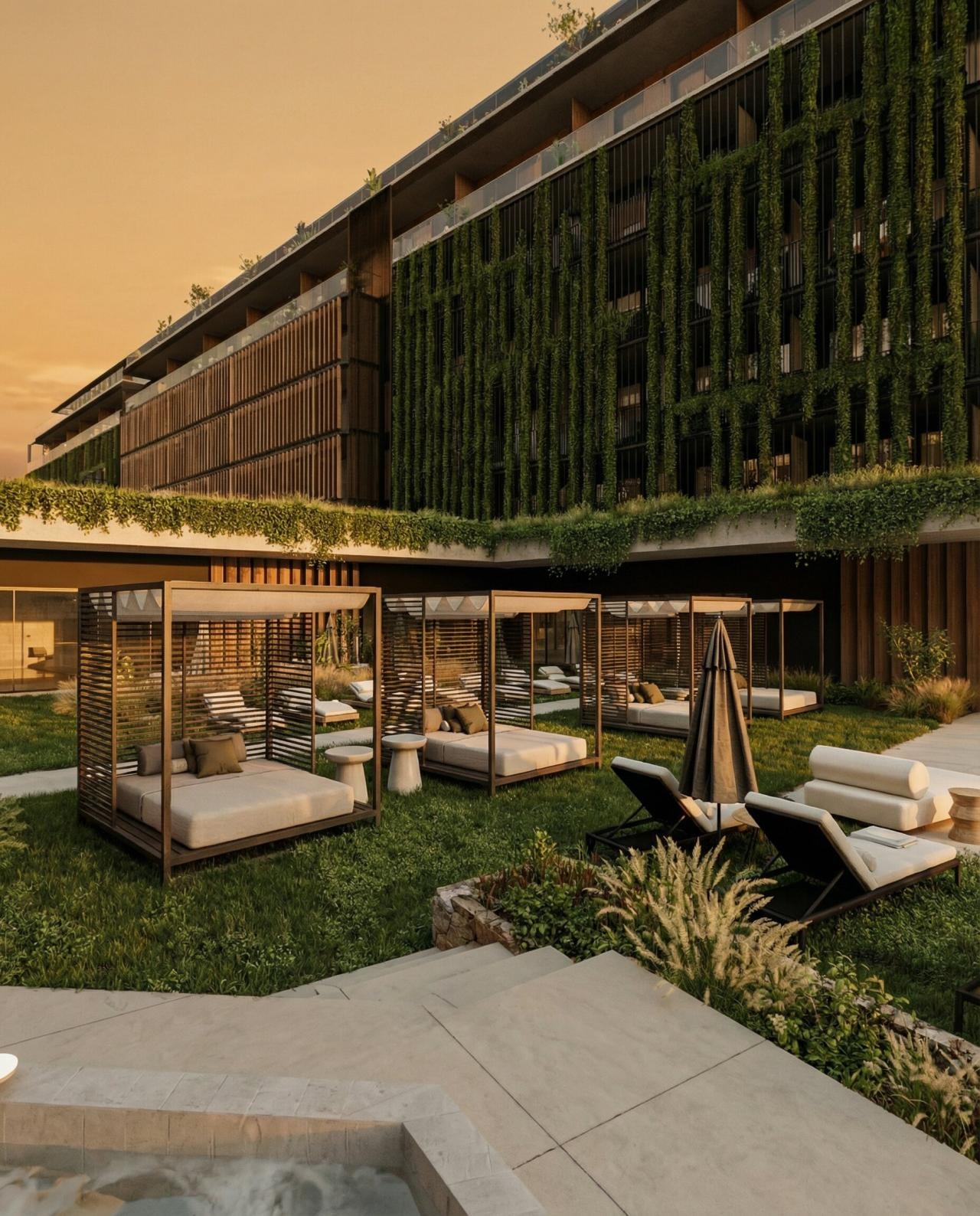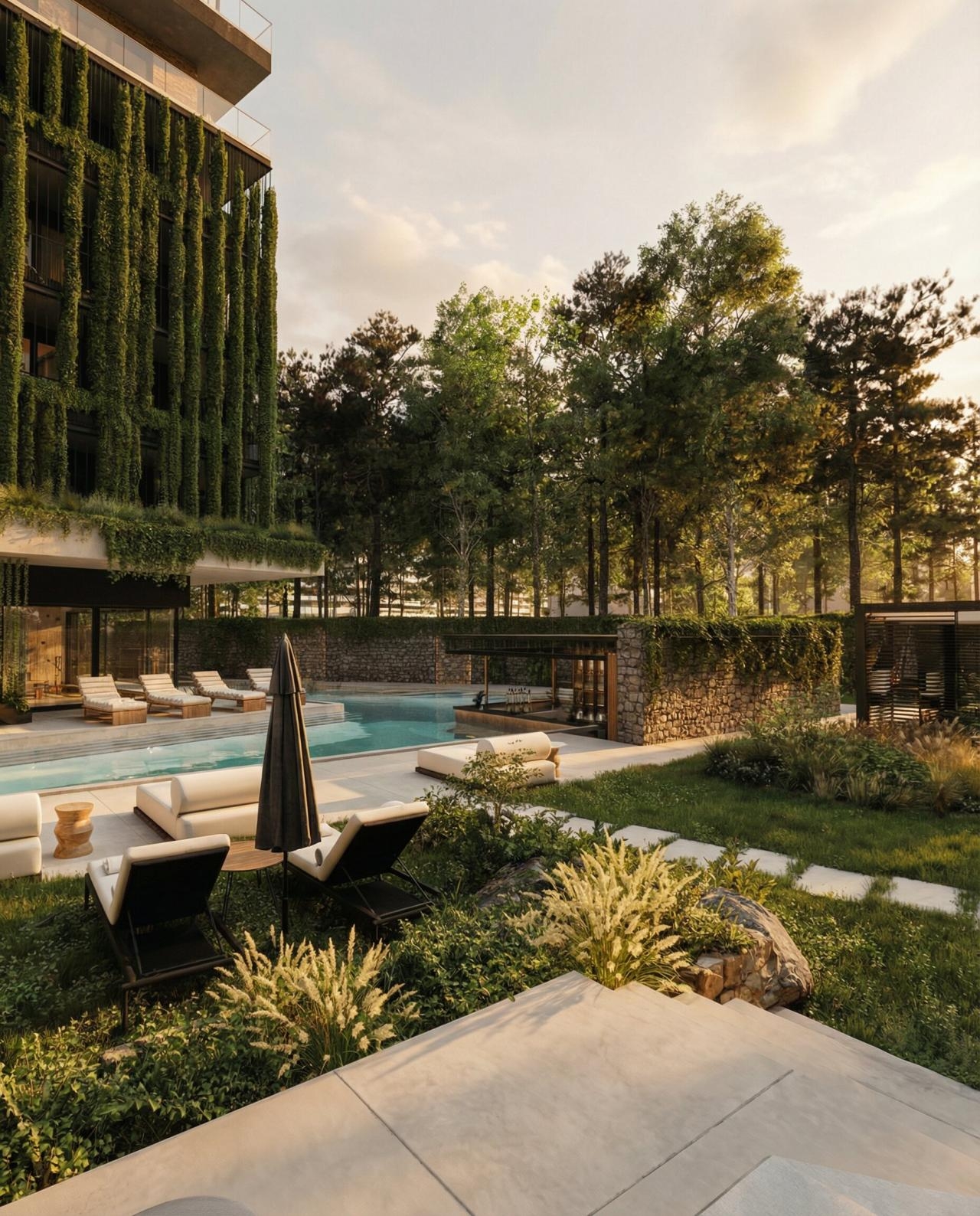 Przestrzenie wspólne to eleganckie lobby klubowe, komfortowe strefy wypoczynku oraz zielone tarasy z dużymi przeszkleniami, które otwierają wnętrza na światło i widoki.