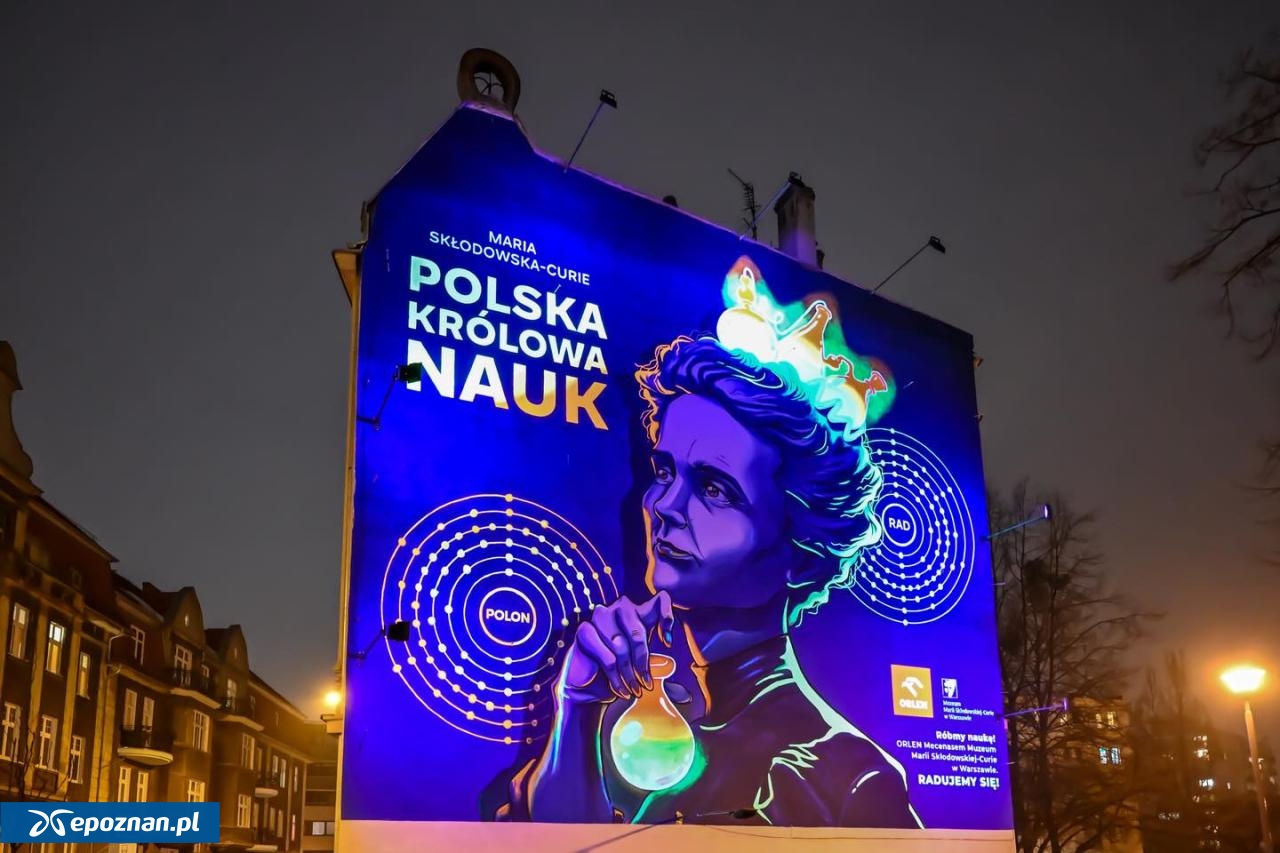 O nowym muralu informuje w mediach społecznościowych Miasto Poznań. "Nowy mural przy ul. Jeżyckiej, a na nim Polska Królowa Nauk, Maria Curie-Skłodowska! Szczególnie polecamy zobaczyć go wieczorem"- czytamy.