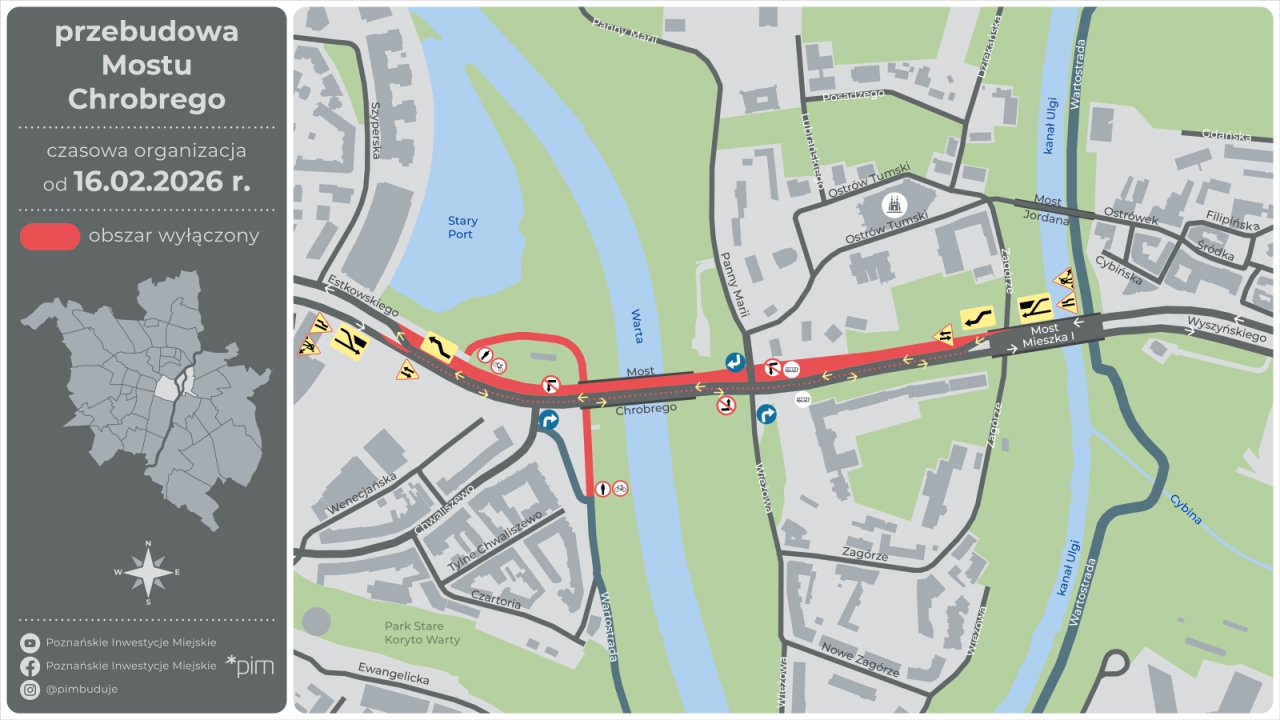 "Jezdnia w stronę centrum zostanie wyłączona na odcinku od Mostu Mieszka I do okolicy ul. Szyperskiej. W ramach prac przygotowawczych w obu tych punktach powstały przewiązki, czyli przejazdy przez torowisko tramwajowe. Dzięki nim kierowcy jadący od Śródki tuż za Mostem Mieszka I wjadą na jezdnię południową, dalej przejadą południową nitką Mostu Chrobrego, a następnie w rejonie ul. Szyperskiej wrócą na jezdnię ul. Estkowskiego prowadzącą do centrum. Chodnik na południowej części mostu pozostanie dostępny"- zapowiadają przedstawiciele PIM.