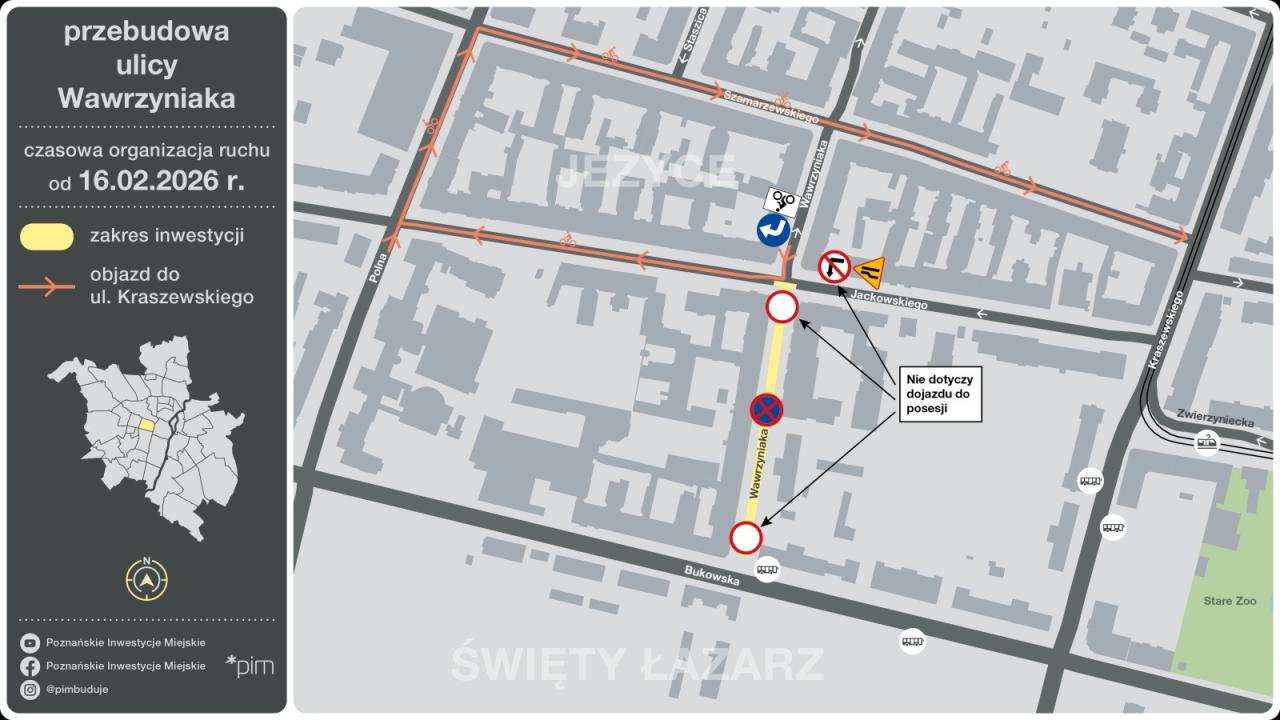 "Aby umożliwić rozpoczęcie prac rozbiórkowych ulica Wawrzyniaka na przebudowywanym odcinku zostanie zamknięta dla ruchu kołowego, a piesi będą mogli poruszać się chodnikiem po wschodniej stronie ulicy. Zakaz nie będzie dotyczył pojazdów służb miejskich, dojazdu do posesji oraz dojazdu do Sądu Rejonowego Poznań Grunwald i Jeżyce. Objazd do ul. Kraszewskiego zostanie poprowadzony ulicami Jackowskiego, Polną i Szamarzewskiego". - informują przedstawiciele PIM.