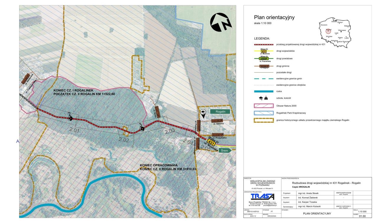 Pod koniec stycznia Wielkopolski Zarząd Dróg Wojewódzkich w Poznaniu podpisał umowę z firmą Transbruk Marek Begier SKA. na realizację kolejnego etapu rozbudowy drogi wojewódzkiej nr 431 na odcinku Rogalinek - Rogalin w gminie Mosina. Projekt obejmuje modernizację drogi na odcinku o długości 1,817 km. W ubiegłym tygodniu informowano, że plac budowy został oddany wykonawcy, a prace potrwają do stycznia 2027 roku.