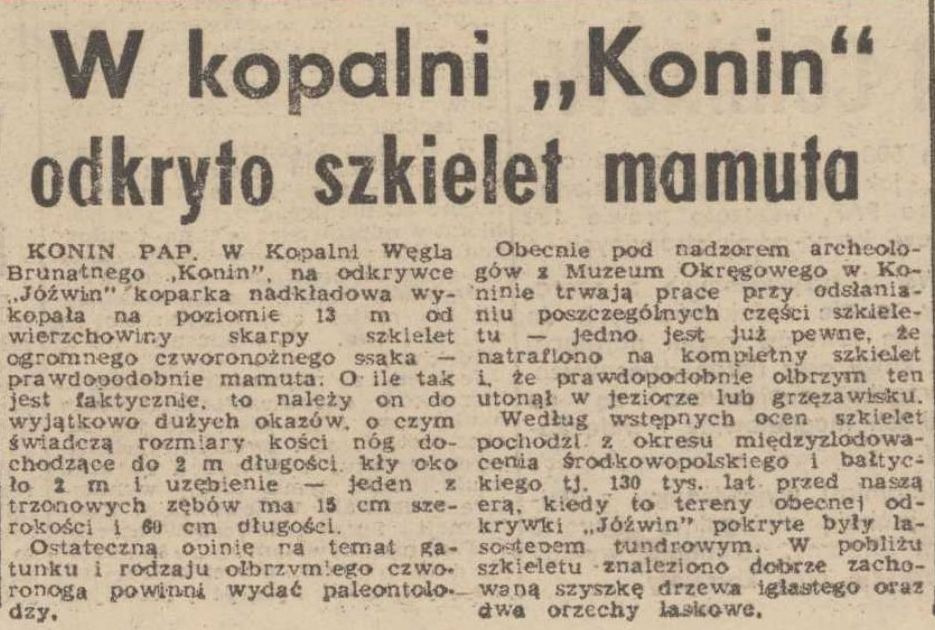 "Początkowo sądzono, że natrafiono na szkielet dużych rozmiarów mamuta włochatego (Mammuthus primigenius). Dopiero później, po badaniach, okazało się, że koparka SRs 1200 wydobyła znacznie cenniejsze i bardziej unikatowe znalezisko. Jest to jeden z trzech szkieletów słonia leśnego, jakie można oglądać w Polsce. Pierwszy został odkryty w Warszawie w 1962 r., drugi w Ciechanowie w 1982 r., a trzeci - uznany za najbardziej kompletny szkielet w Europie - w 1984 r. w Jóźwinie"- dodano.