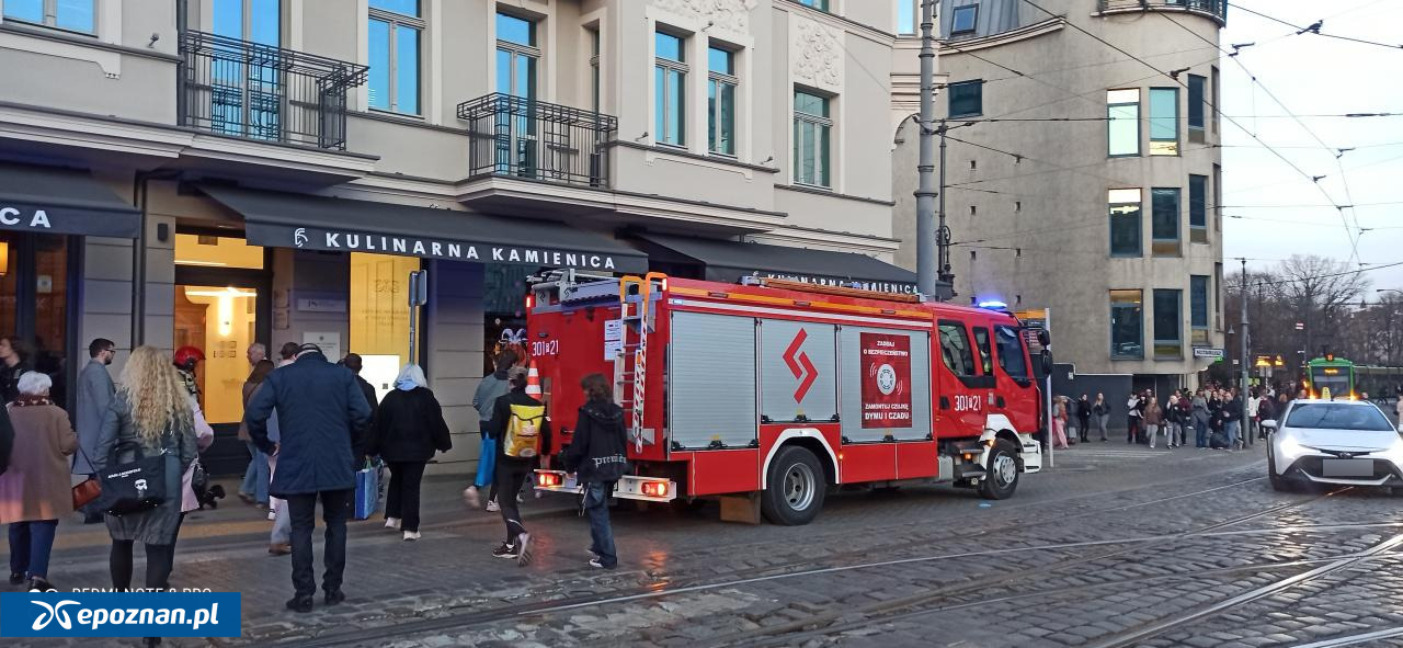 Kilka strażackich zastępów przy kamienicy w centrum Poznania