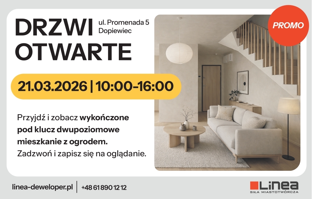 Z ogromną przyjemnością zapraszamy na Drzwi Otwarte Linea Deweloper, który odbędzie się w pierwszą sobotę wiosny, 21 marca 2026 roku, w godzinach od 10:00 do 16:00. Czekamy na Was w naszym biurze sprzedaży na osiedlu Dąbrówka - Leśna Polana, przy ul. Promenada 5 w Dopiewcu.
