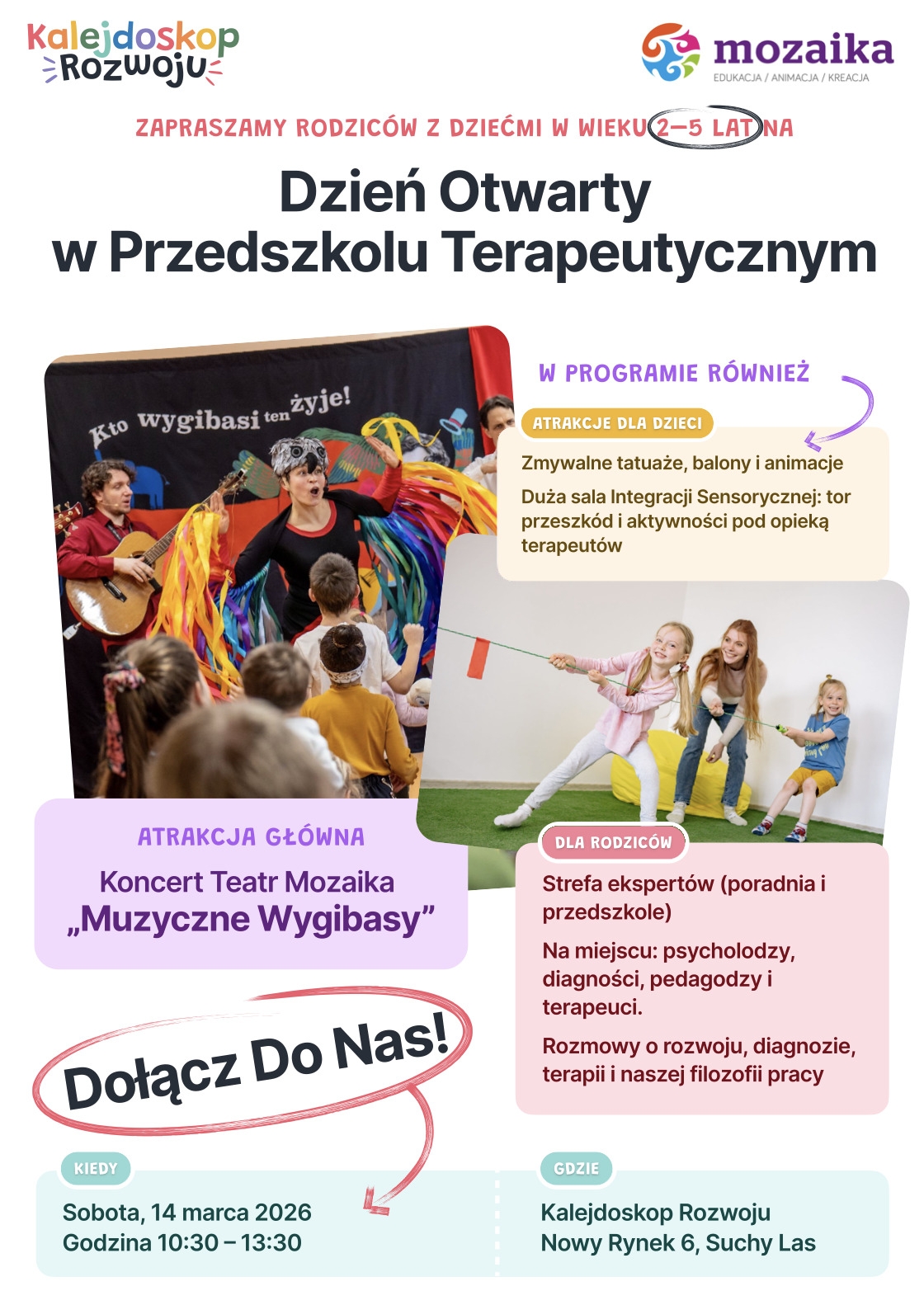 Rodzice, którzy rozważają zapisanie dziecka do przedszkola terapeutycznego, często mają wiele pytań. Dlatego Kalejdoskop Rozwoju organizuje dzień otwarty połączony z obchodami drugich urodzin placówki, podczas którego można spokojnie poznać miejsce i jego zespół.
