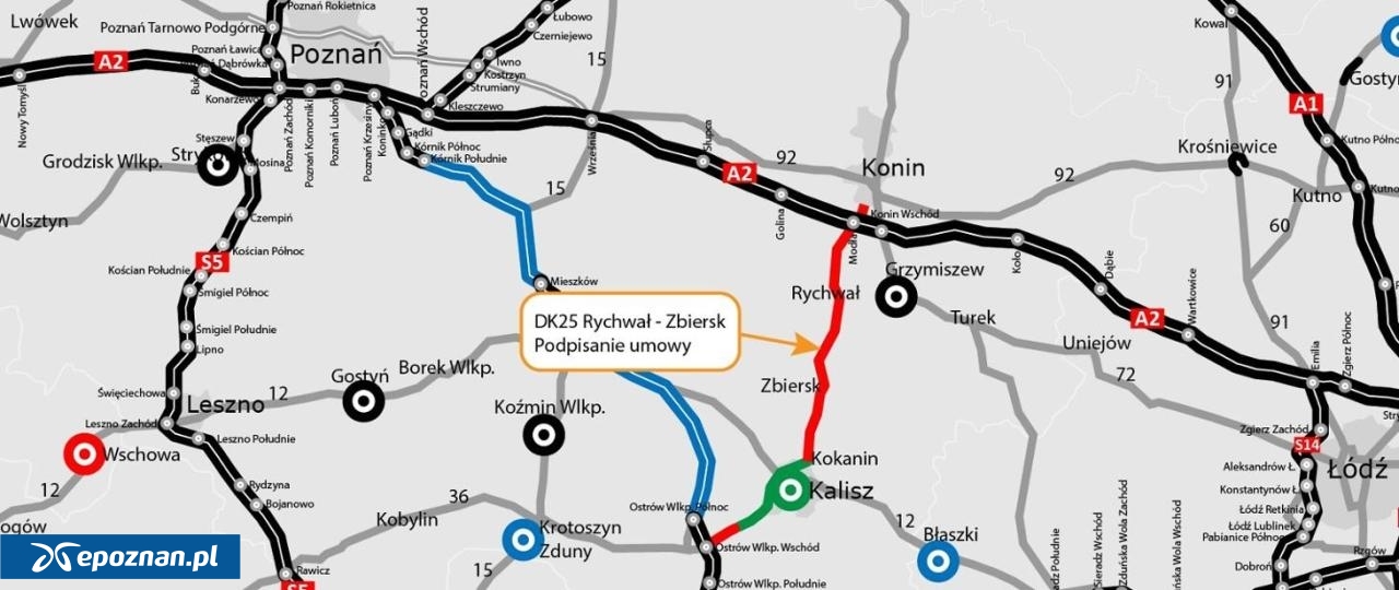 Generalna Dyrekcja Dróg Krajowych i Autostrad podpisała umowę na zaprojektowanie i rozbudowę drogi krajowej nr 25. Chodzi o czwarty z pięciu odcinków tej trasy, konkretnie między Rychwałem a Zbierskiem. Wykonawcą została firma POLAQUA, która ma 39 miesięcy na ukończenie robót. - Umowa opiewa na kwotę 379,1 mln zł. Inwestycja będzie realizowana w formule "Projektuj i buduj". Wykonawca w ciągu 10 miesięcy przygotuje projekt budowlany i złoży do Wojewody Wielkopolskiego wniosek o pozwolenie na budowę (tj. decyzję o zezwoleniu na realizację inwestycji drogowej - ZRID). Jej uzyskanie powinno potrwać ok. siedmiu miesięcy. Prace budowlane w terenie zaplanowane zostały na kolejne 22 miesiące, z wyłączeniem przerw zimowych (16 grudnia - 15 marca). Rozpoczęcie robót przewidziane jest na IV kwartał 2027 roku - wyjaśnia Alina Cieślak z GDDKiA w Poznaniu.