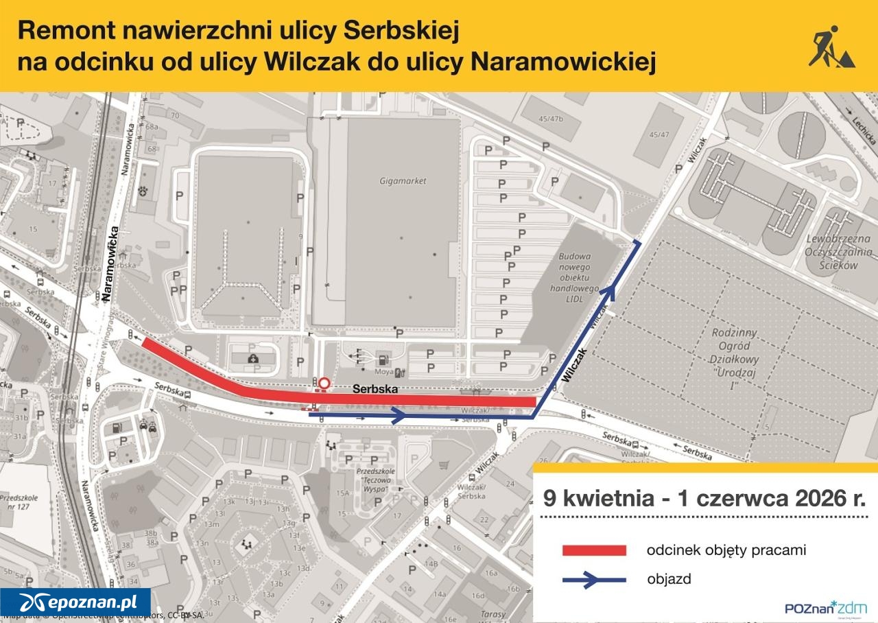 W czwartek, 9 kwietnia prace drogowe rozpoczną się na północnej jezdni ulicy Serbskiej na odcinku między ulicami Wilczak i Naramowicką. Trasa zyska nową nawierzchnię, całość ma się odbywać etapami. - Kierowcy muszą liczyć się z zawężeniem jezdni, czasowymi zmianami w organizacji ruchu, wprowadzeniem objazdu oraz ograniczeniem prędkości do 40 km/h - zaznacza Zarząd Dróg Miejskich.