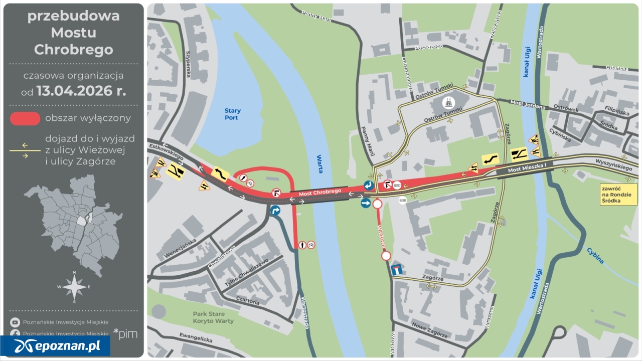 "Zamknięty zostanie kilkudziesięciometrowy odcinek od ul. Wyszyńskiego do końca skweru św. Zygmunta Szczęsnego Felińskiego. Niedostępny będzie również chodnik po zachodniej stronie ul. Wieżowej na tym odcinku. Wprowadzony zostanie objazd do ul. Wieżowej i ul. Zagórze przez ul. Ostrów Tumski. Oznacza to, że kierowcy jadący od strony Mostu Chrobrego będą musieli dojechać do ronda Śródka i tam wjechać na północną jezdnię ul. Wyszyńskiego, by następnie skręcić w prawo w ul. Ostrów Tumski. Przywrócenie ruchu na ul. Wieżowej planowane jest najpóźniej 24 kwietnia, jednak wykonawca dołoży starań, by konieczne prace zostały zrealizowane jak najszybciej - w ciągu kilku dni" - informują przedstawiciele Poznańskich Inwestycji Miejskich.