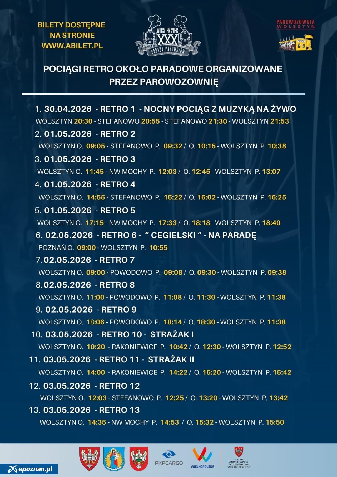 2 maja, zgodnie z wcześniejszymi zapowiedziami, w Wolsztynie odbędzie się Parada Parowozów, która przyciąga miłośników kolei z całego kraju, a nawet z innych państw. I choć główne wydarzenia odbędą się właśnie w sobotę (choćby tytułowa parada parowozów czy widowisko "Światło, Para, Dźwięk"), już wcześniej, bo od 30 kwietnia, planowane są przejazdy retro pociągów. W tym roku będzie ich aż 13.