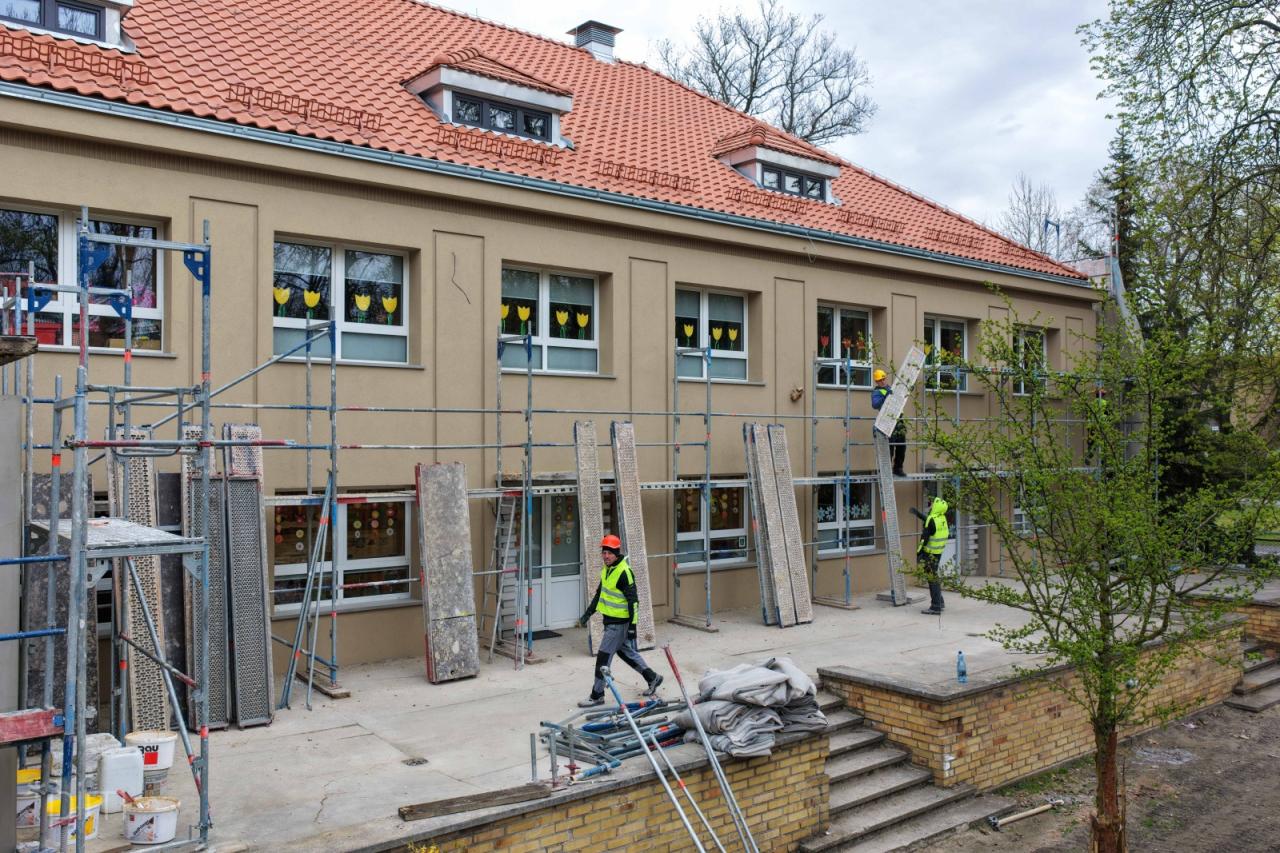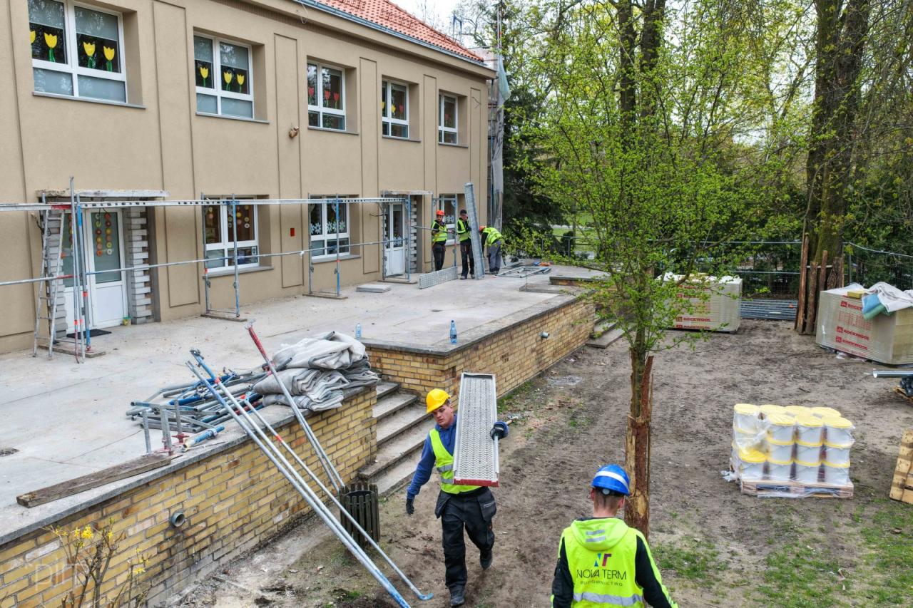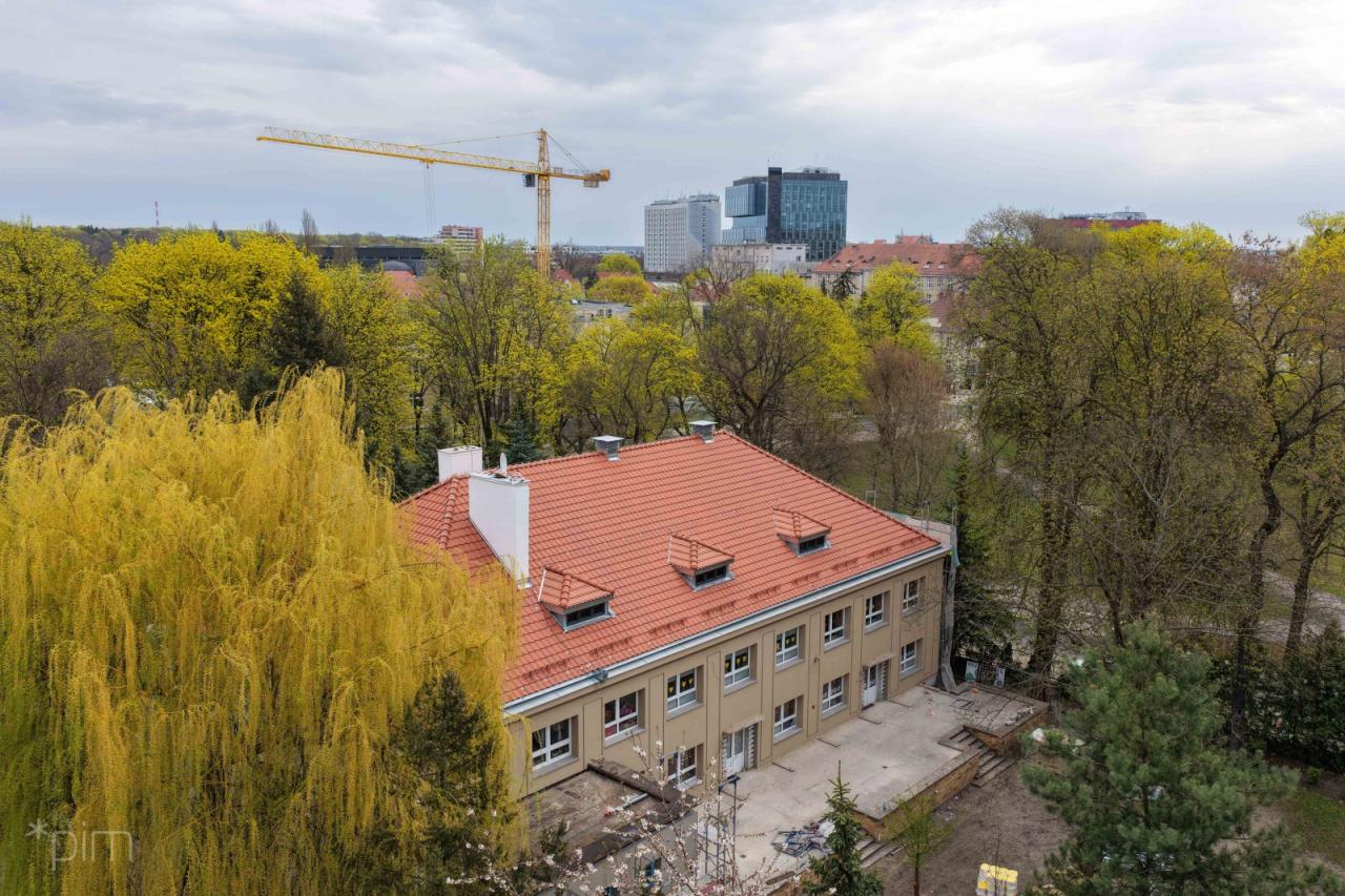 Budynek przedszkola nr 66 "Zaczarowany Ogród" przechodzi obecnie modernizację. Trwają prace związane z wymianą pokrycia dachowego oraz termomodernizacją elewacji, które poprawią stan techniczny obiektu i jego estetykę.