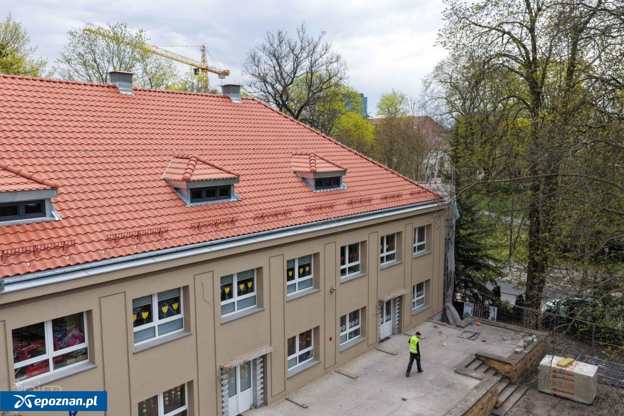 "Pierwsze efekty prac są już dobrze widoczne, gdyż zakończył się montaż nowej dachówki ceramicznej. Wykonane zostało również niezbędne orynnowanie. Poddasze zostało też ocieplone, a drewnianą konstrukcję dachu zabezpieczono impregnatem. Aktualnie wykonawca inwestycji koncentruje się na remoncie elewacji, która jest ocieplana i tynkowana. W kolejnych krokach przewidziany jest remont tarasu, schodów, balustrad i ułożenie nowych nawierzchni wokół budynku" - mówi Tomasz Płóciniczak, wiceprezes spółki Poznańskie Inwestycje Miejskie.
