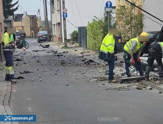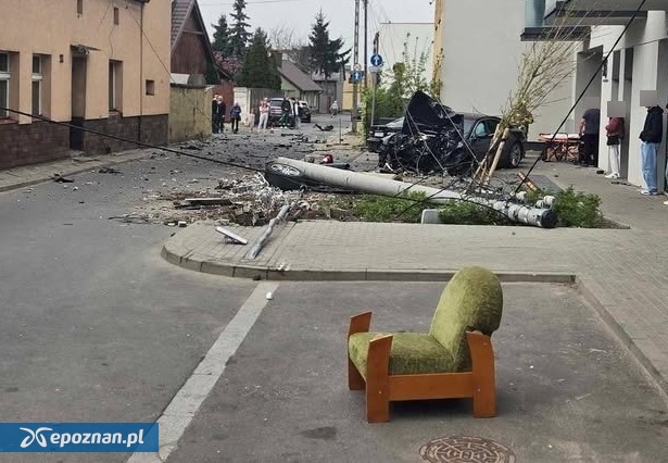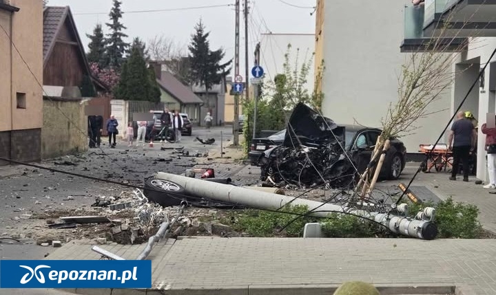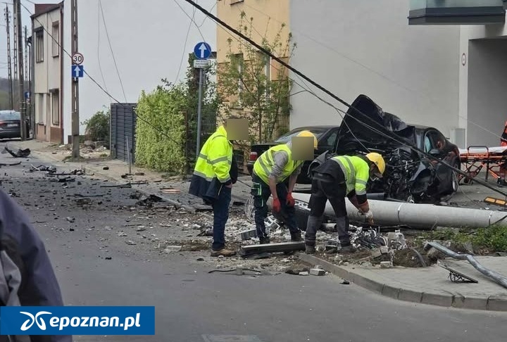 Akcja służb w Swarzędzu. Demolka na ulicy po uderzeniu Porsche w słup