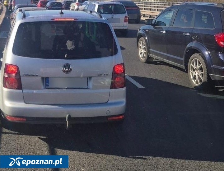 Korek na trasie Pniewy-Międzychód. Samochód znalazł się w rowie