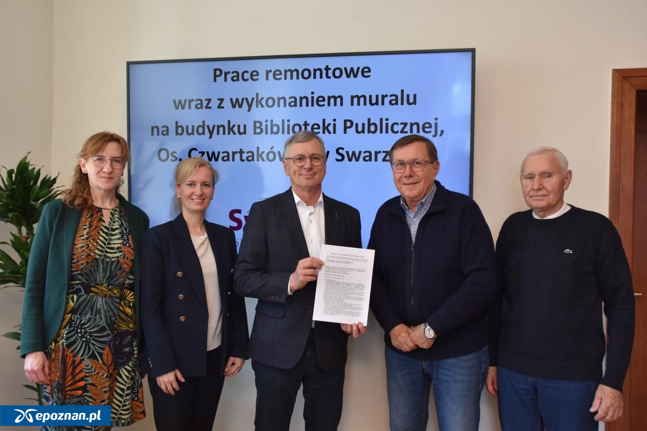21 kwietnia w swarzędzkim ratuszu podpisano umowę na przebudowę i remont schodów zewnętrznych, pochylni i elewacji wraz z wykonaniem muralu na budynku Biblioteki Publicznej przy os. Czwartaków 1 w Swarzędzu.