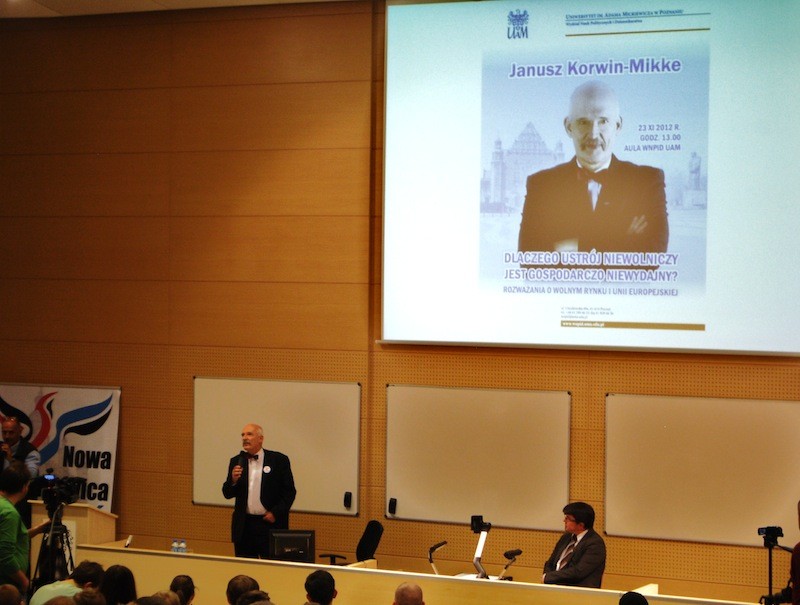 To kolejna wizyta Korwina-Mikke w Poznaniu. Tym razem polityk wygłosił wykład na Wydziale Nauk Politycznych i Dziennikarstwa UAM na temat "Dlaczego ustrój niewolniczy jest gospodarczo niewydajny? Rozważania o wolnym rynku i Unii Europejskiej". Swoje wystąpienie założyciel Unii Polityki Realnej rozpoczął od rozrysowania na tablicy swoich teorii związanych z gospodarką.