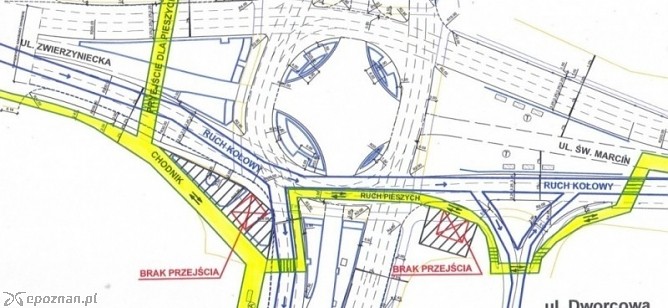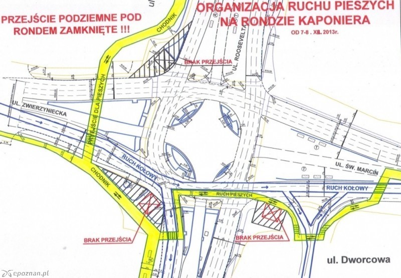 Wciąż będzie można korzystać z przejścia przez ulicę Zwierzyniecką. Ale pojawi się też nowe przejście dla pieszych. - Tymczasowe przejście dla pieszych zostanie wyznaczone przez ulicę Roosevelta przy skrzyżowaniu z południową jezdnią ulicy Zwierzynieckiej. Stąd piesi przejdą po fragmencie nieczynnej południowej jezdni ronda Kaponiera skąd dotychczasową trasą dojdą do ulicy Dworcowej - kończy ZDM. By zapewnić pieszym bezpieczeństwo przejście zostanie ogrodzone siatką.