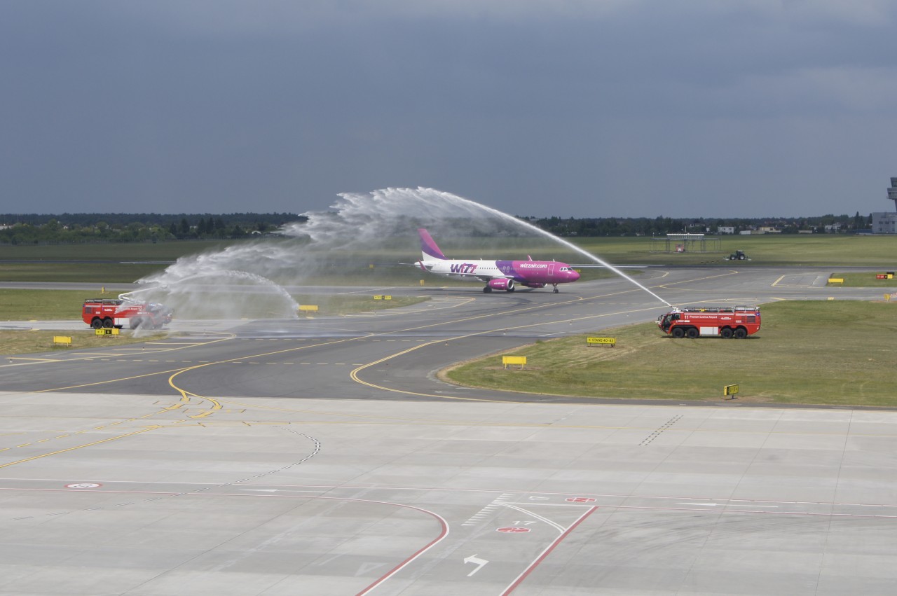 Po godzinie 13.00 na Ławicy wylądował drugi samolot WizzAir, którego zadaniem jest obsługa ruchu na poznańskim lotnisku. - Przyleciał z Gdańska w ramach przebazowania. W czasie kołowania na płytę postojową został przywitany salutem wodnym przez Lotniskową Służbę Ratowniczo-Gaśniczą - wyjaśnia Hanna Surma, rzeczniczka lotniska. - Dziś w nocy po raz pierwszy na lotnisku będą "nocować" dwa samoloty tego przewoźnika - dodaje.