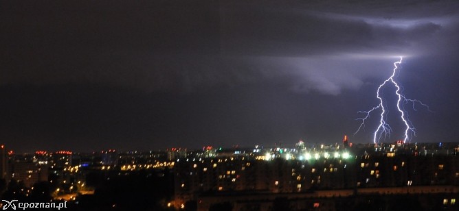 Instytut Meteorologii i Gospodarki Wodnej we wtorkowe popołudnie wydał ostrzeżenie przed burzami dla naszego województwa. Obowiązuje od 23.00 we wtorek do 8.00 rano w środę. Ostrzeżenie okazało się jak najbardziej zasadne - około północy w Poznaniu zaczęła się burza, która zapewniła mieszkańcom spektakularne widowisko na niebie. Niestety spowodowała też wiele szkód, o czym napiszemy wkrótce.