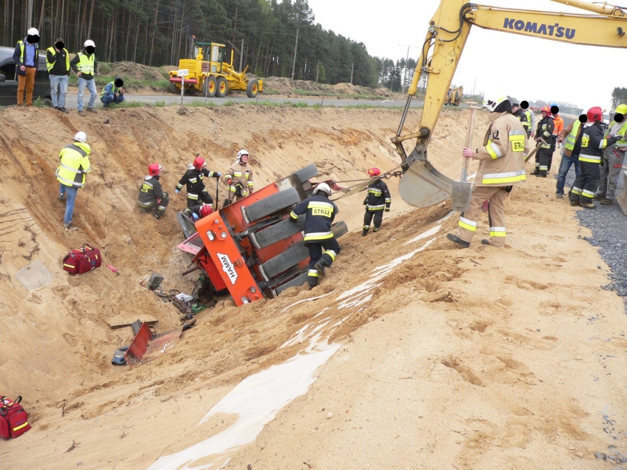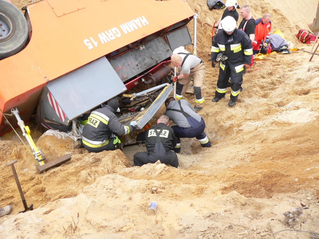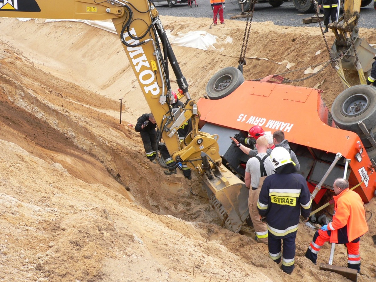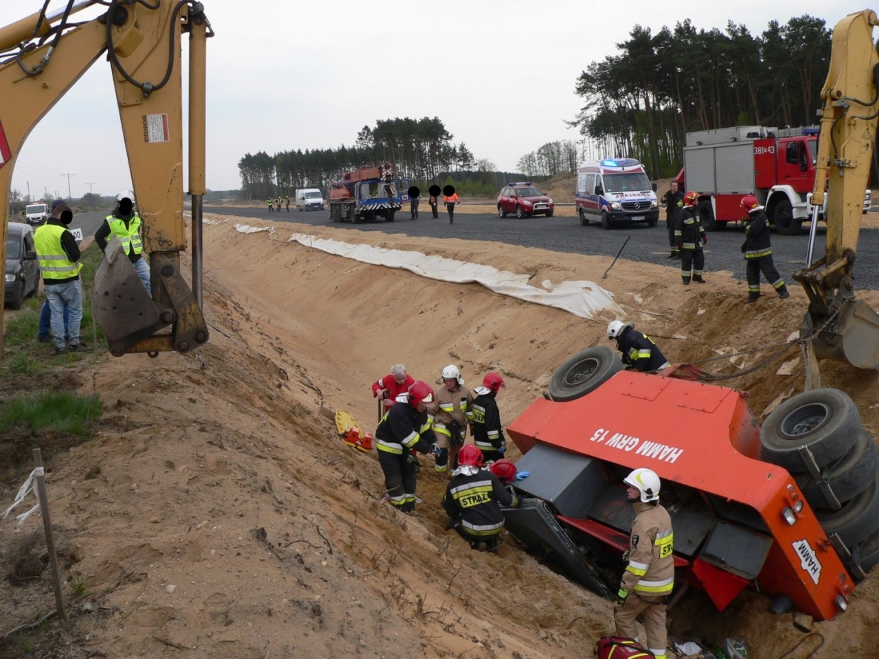 Na miejscu interweniowały cztery zastępy straży pożarnej -Po dojeździe i zabezpieczeniu miejsca zdarzenia, działania zastępów skupione zostały na stabilizacji pojazdu, aby wyeliminować jego dalsze obsunięcia, które mogłyby zagrażać życiu poszkodowanego. W W celu ewakuowania uwięzionego operatora niezbędne okazało się wycięcie zmiażdżonych elementów kabiny pojazdu i wykonanie odpowiedniego podkopu. Wykonane czynności umożliwiły ewakuacje poszkodowanego na deskę ortopedyczną i przetransportowanie do karetki pogotowia ratunkowego - dodaje Kurpisz.