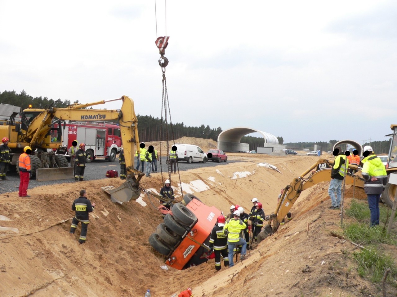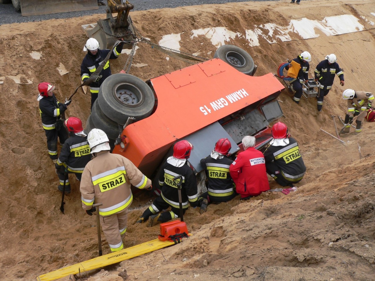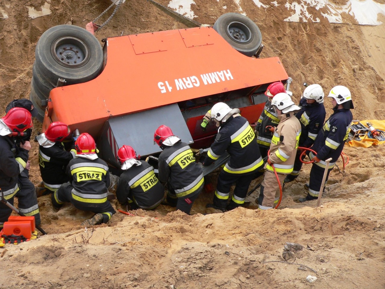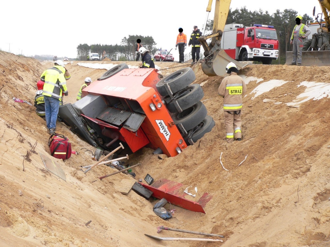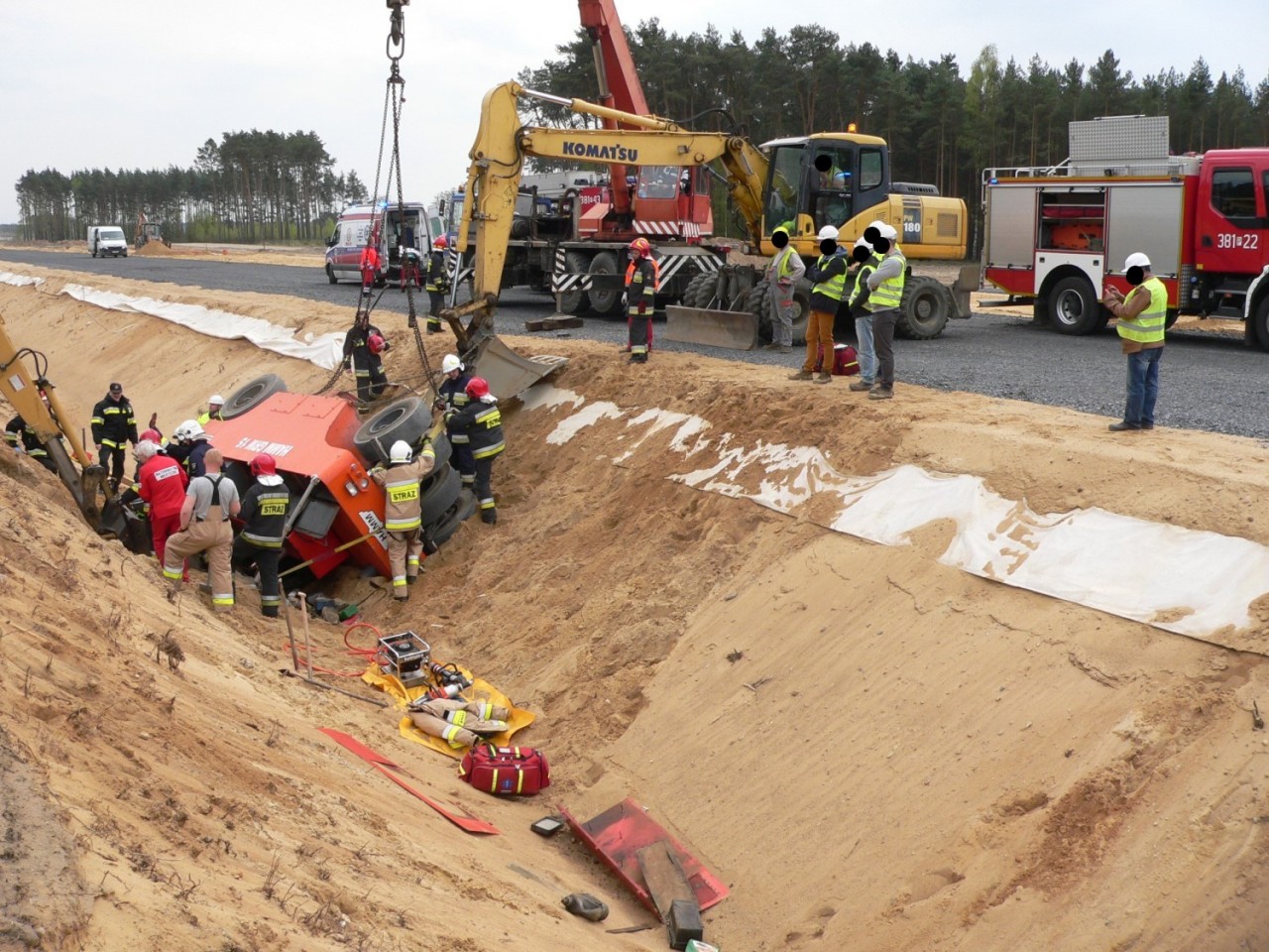 Na miejscu interweniowały cztery zastępy straży pożarnej -Po dojeździe i zabezpieczeniu miejsca zdarzenia, działania zastępów skupione zostały na stabilizacji pojazdu, aby wyeliminować jego dalsze obsunięcia, które mogłyby zagrażać życiu poszkodowanego. W W celu ewakuowania uwięzionego operatora niezbędne okazało się wycięcie zmiażdżonych elementów kabiny pojazdu i wykonanie odpowiedniego podkopu. Wykonane czynności umożliwiły ewakuacje poszkodowanego na deskę ortopedyczną i przetransportowanie do karetki pogotowia ratunkowego - dodaje Kurpisz.
