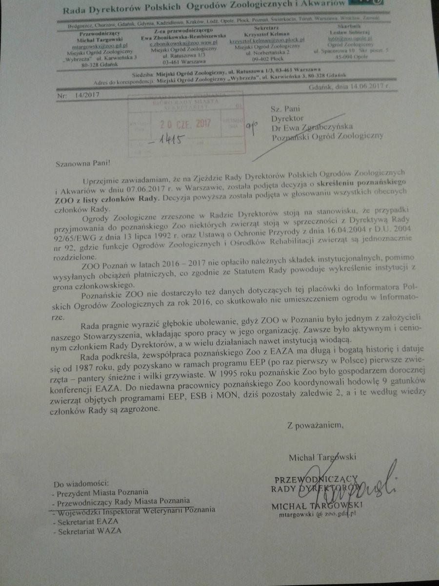 Poznańskie ZOO w ostatnich latach zrobiło wiele dla zwierząt i było chwalone za swoją działalność. Niestety pojawiły się też problemy formalne, a ich efektem była chwilowa utrata statusu ogrodu zoologicznego. Ostatecznie sprawę udało się wyjaśnić, a ZOO odzyskało status. We wtorek radny PO Tomasz Lipiński poinformował o kolejnych problemach ZOO - Poznańskie ZOO zostało wyrzucone z Rady Dyrektorów Polskich Ogrodów Zoologicznych i Akwariów - napisał radny w serwisie Twitter i załączył zdjęcie pisma podpisanego przez Michała Targowskiego - przewodniczącego rady.
