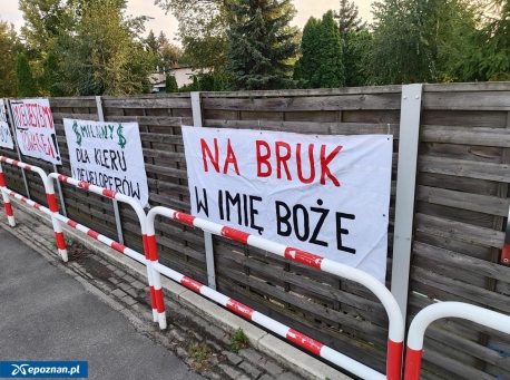 Wymowne banery na osiedlu Maltańskim: "Na bruk w imię boże", "1 wyrzucona rodzina 1 milion dla parafii"