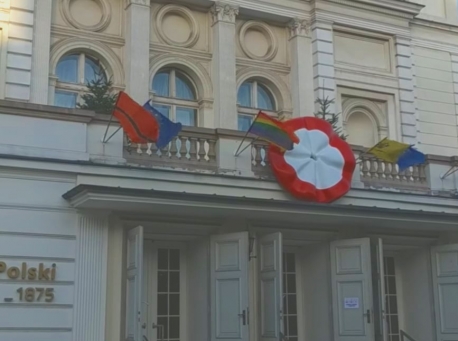 Flagi LGBT przy rozecie powstańczej na Teatrze Polskim. "Wybuduj sobie Pan budynek za własne pieniądze i oflaguj"