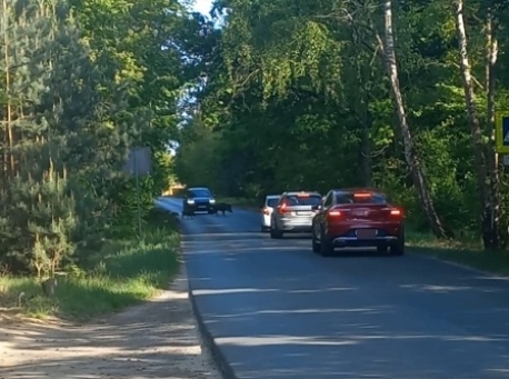Duże stado dzików przechodziło przez jezdnię. Samochody na chwilę zatrzymały ruch