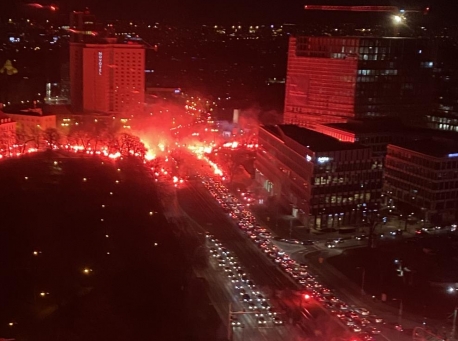 Kibice Lecha odpalili race niedaleko pomnika Powstańców Wielkopolskich. Cała ulica w czerwonym kolorze