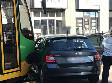 Auto stoczyło się z chodnika i zablokowało ruch tramwajowy w centrum Poznania