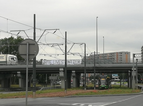 Baner "White Lives Matter" na wiadukcie nad ulicą Żegrze
